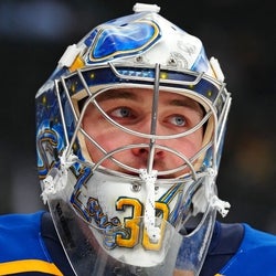 St Louis Blues Goaltender Joel Hofer 30 Inspects His Helmet During The First Period Of The Team S Nhl Hockey Preseason Game Against The Dallas Stars On Saturday Oct 1 2022 In Independence